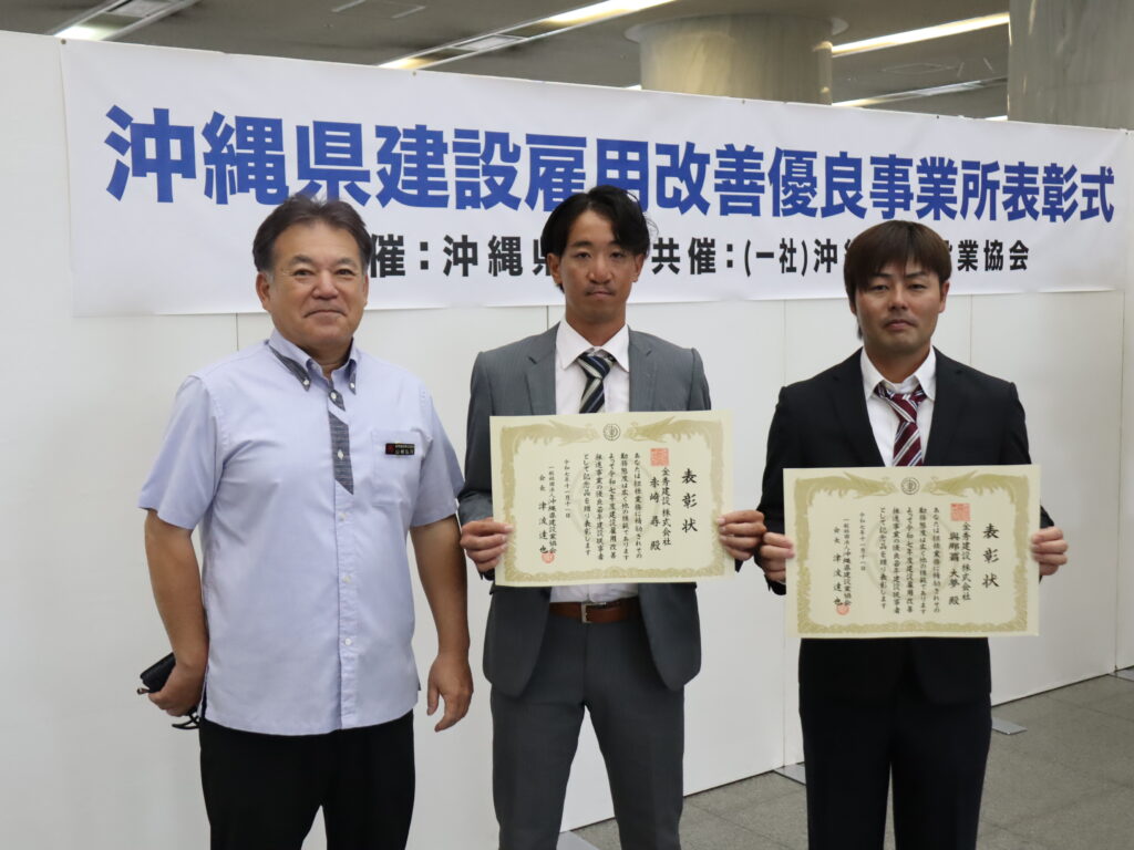 一般社団法人 沖縄県建設業協会より弊社の社員である赤崎尋さんと與那覇大夢さんが優良若年建設従事者として表彰されました。